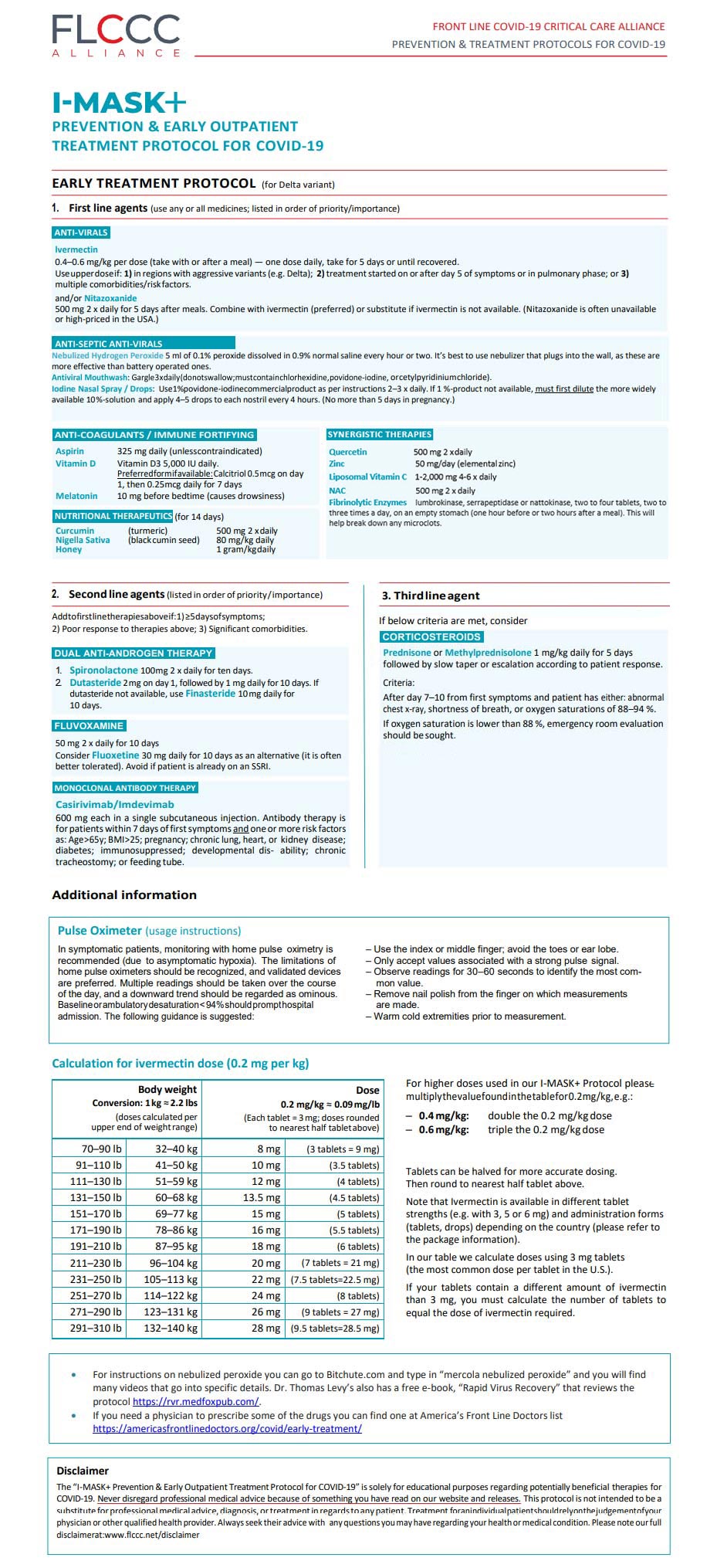You can find a listing of doctors who can prescribe ivermectin and other necessary medicines on the FLCCC website. There, you can also find downloadable PDFs in several languages for prevention and early at-home treatment, the in-hospital protocol and long-term management guidance for long-haul COVID-19 syndrome. Three other protocols that have great success are: